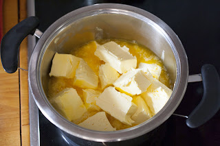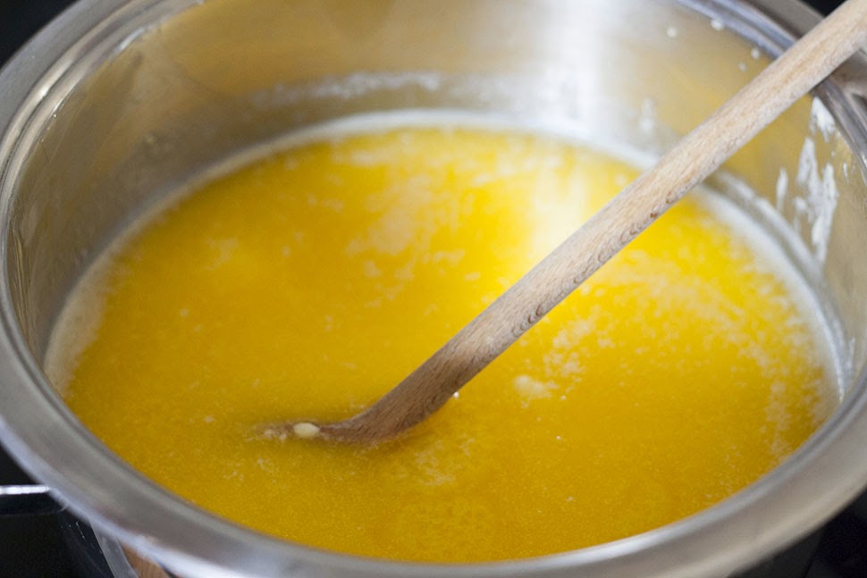Dann die Hitze weit herunterdrehen und die Butter ca. 30 Minuten köcheln lassen, dabei nicht mehr umrühren.